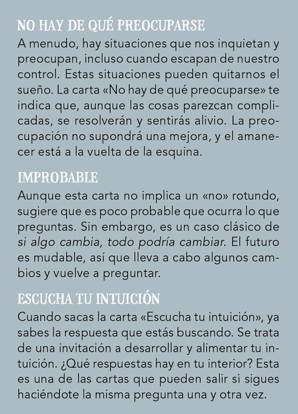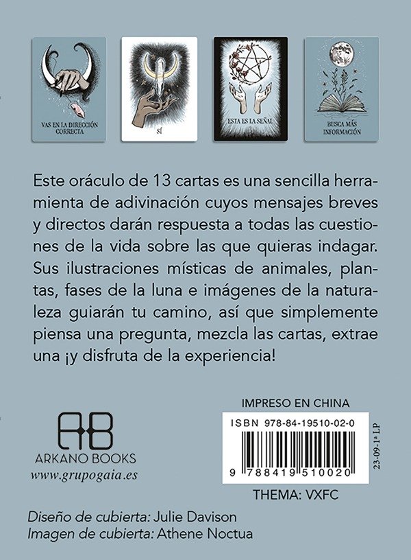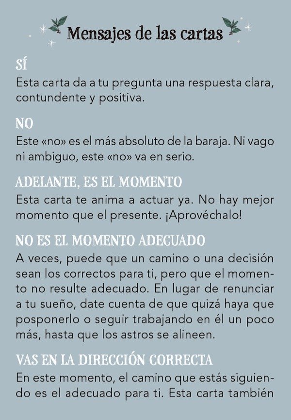 Sus ilustraciones místicas de animales, plantas, fases de la luna e imágenes de la naturaleza guiarán tu camino, así que simplemente piensa una pregunta, mezcla las cartas, extrae una ¡y disfruta de la experiencia!