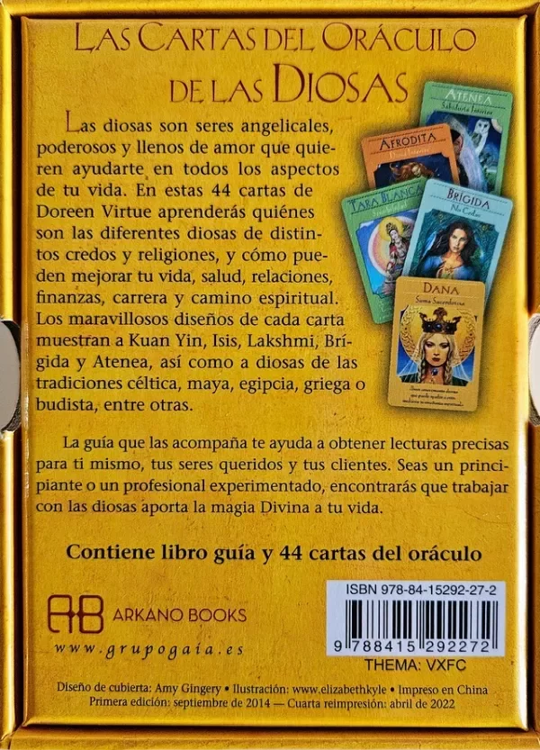 Las diosas son seres angelicales, poderosos y llenos de amor que quieren ayudarte en todos los aspectos de tu vida. En estas 44 cartas de Doreen Virtue aprenderas quienes son las diferentes diosas de distintos credos y religiones, y como pueden mejorar tu vida, salud, relaciones, finanzas, carrera y camino espiritual.Los maravillosos diseños de cada carta muestran a Kuan Yin, Isis, Lakshmi, Brigida y Atenea, asi como a diosas de las tradiciones celtica, maya, egipcia, griega o budista, entre otras.La guia que las acompaña te ayuda a obtener lecturas precisas para ti mismo, tus seres queridos y tus clientes. Seas un principiante o experimentado profesional, encontraras que trabajar con las diosas aporta la magia Divina a tu vida.
