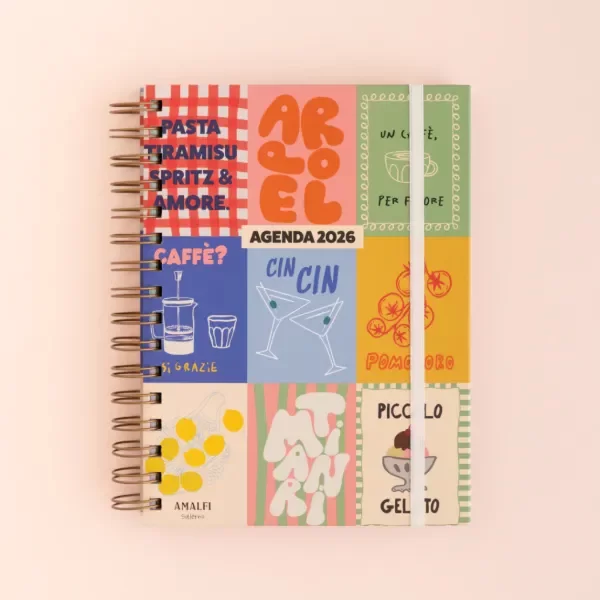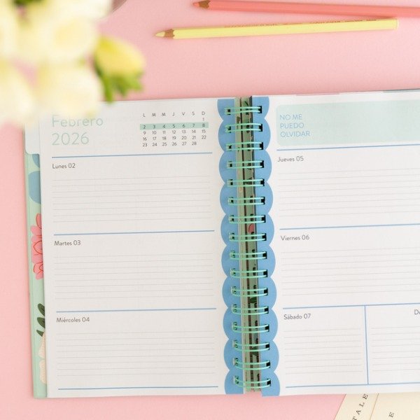 Es semana a la vista, tamaño A5, con tapa dura y elástico a tono. Encuadernación en espiral. Agenda de 100 hojas, impresa en papel obra de 80gr. El interior es el mismo en todas las agendas.